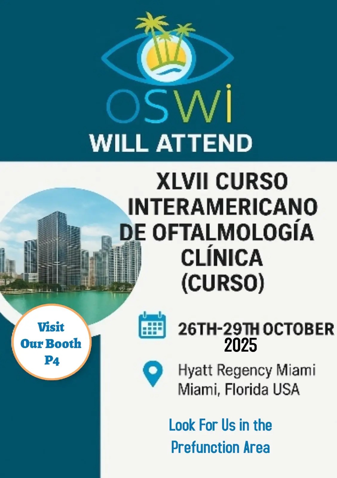We’re excited to attend the XLVII Curso Interamericano de Oftalmología Clínica (CURSO) from October 26th–29th, 2025 at the Hyatt Regency Miami. Visit our booth P4 and connect with us in the Prefunction Area — let’s talk innovation, vision care, and collaboration across the region! OSWI #EyeCareExcellence #OphthalmologyConference #Miami2025 #EyeHealth #VisionCare #Ophthalmology #MedicalConference #EyeCareProfessionals #Networking #GlobalVision