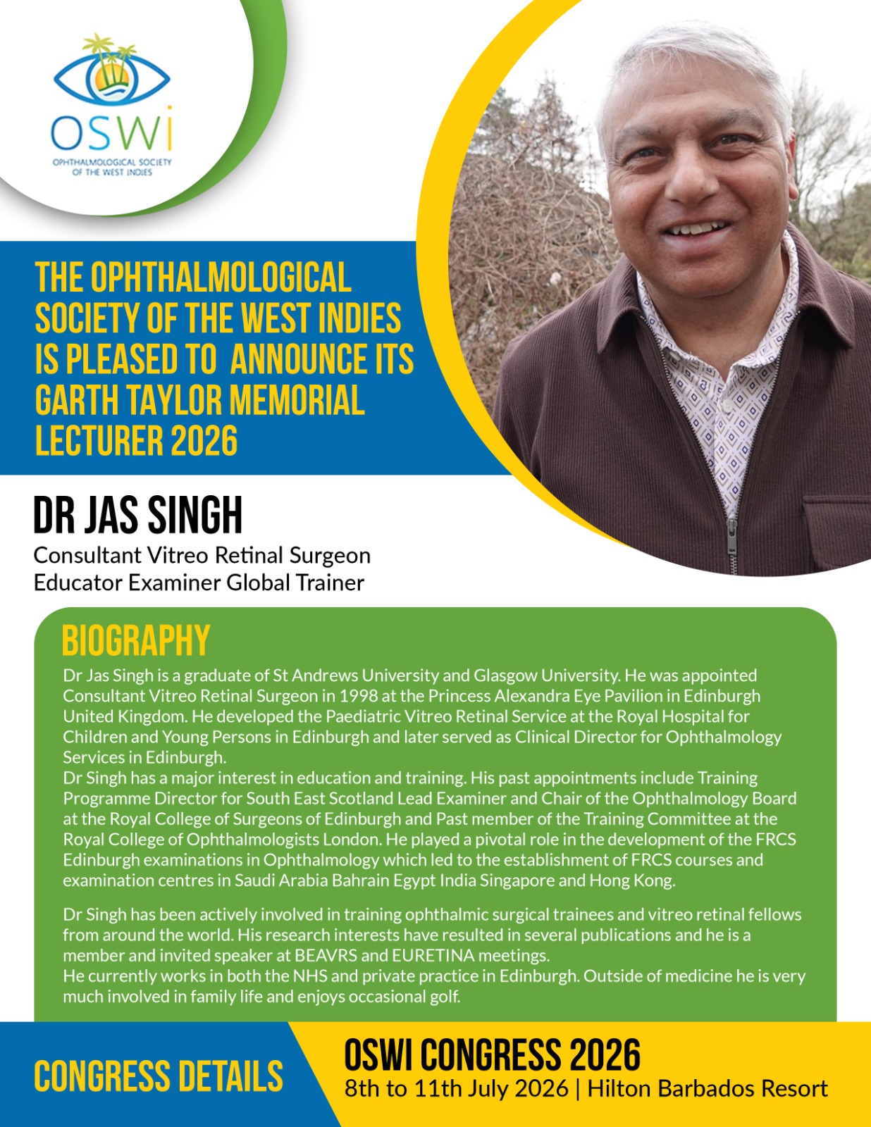 Honouring Excellence. Celebrating Legacy. Inspiring the Future. The Ophthalmological Society of the West Indies is proud to announce Dr Jas Singh as the Garth Taylor